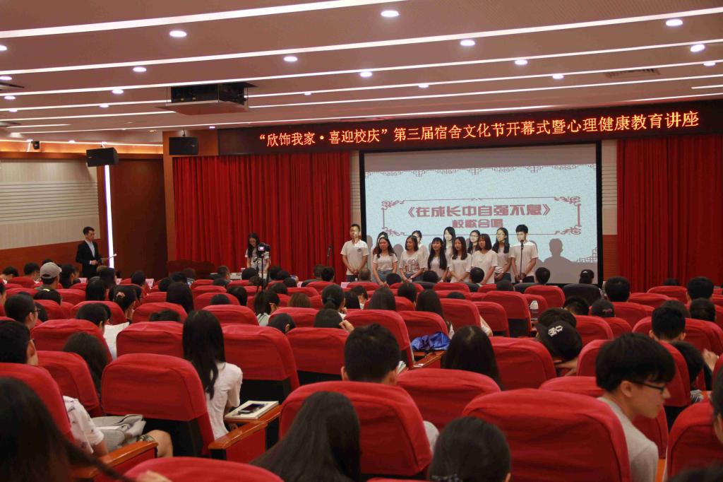 开幕式在宿舍心理剧《不散不见》的演绎中拉开帷幕。学生演员们结合身边案例,精心编排,就当前大学生宿舍关系问题进行了精彩演绎与深刻诠释,丝丝入扣的表演赢得现场热烈的掌声。其次,总务处负责人进行了开幕致辞,他在回顾历年宿舍文化节活动基础上就大学生宿舍文化节举办的目的及意义、宿舍文化节整体部署安排进行了开幕动员,希望全体白云校区学生们从点滴做起、从宿舍做起,积极参与到本届宿舍文化节活动中来,以实际行动共同营造安全、和谐、温馨宿舍环境,以饱满的热情迎接党的十九大和60周年校庆。开幕式在《在成长中自强不息》校歌合唱中落下了帷幕。开幕式结束后,学校心理健康中心任增辉老师为学生们作了题为“温暖宿舍?快乐同住”的心理健康教育讲座。