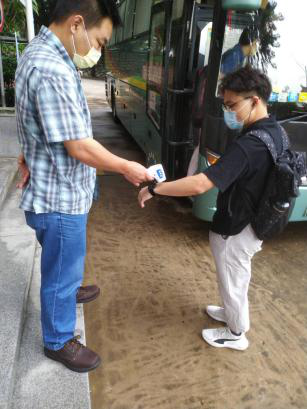 司机坚持对教职员工乘车前进行体温检测,并监督教职员工是否佩戴一次性口罩。严格执行广东技术师范大学疫情期间交通保障方案