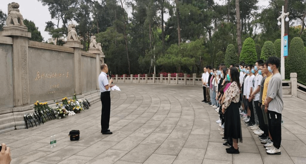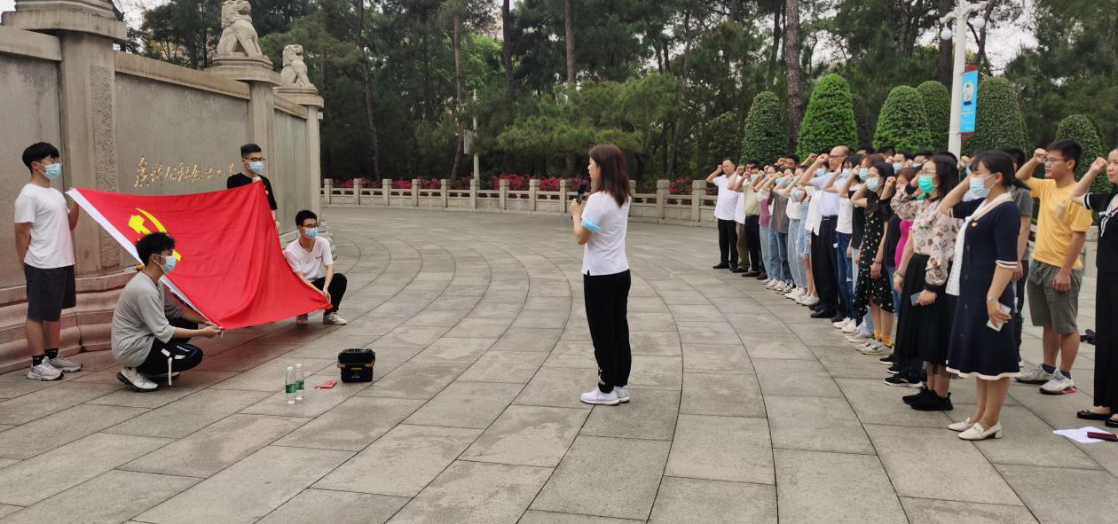 当天下午,后勤处第三党支部党员同志与光电工程学院学生创新创业党支部党员同志一同来到广州烈士陵园进行缅怀先烈、祭扫教育活动。首先参加活动的党员同志向烈士墓敬献鲜花、默哀,随后光电工程学院罗君辉书记在烈士墓前向党员同志们分享了广州起义的党史故事。在本次活动的尾声,后勤处党总支赵珲书记带领全体党员同志重温入党誓词。