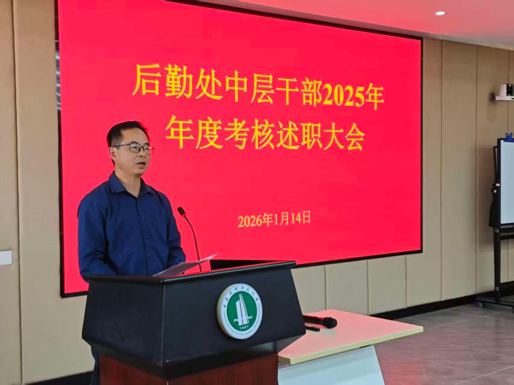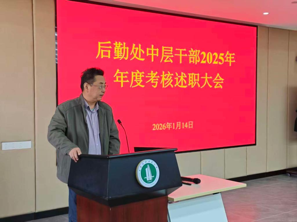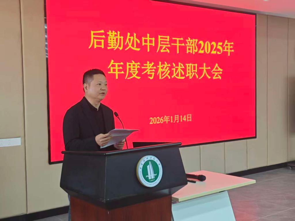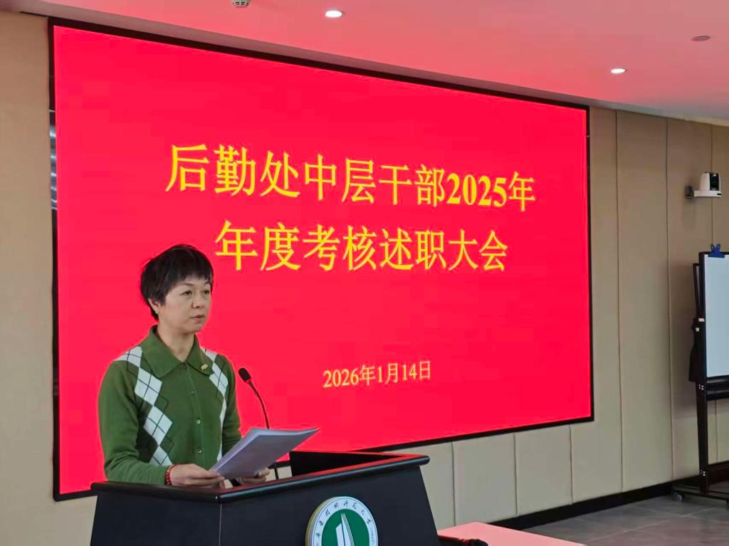 1月14日,后勤处在东校区召开中层干部2025年年度述职大会,后勤处领导班子全体成员、各科室及中心实体有关职工参会。